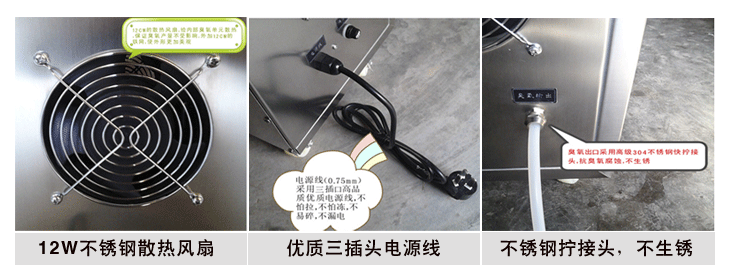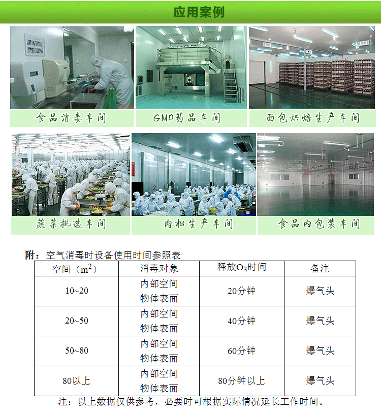 3、 空氣型臭氧殺菌消毒機采用空氣為原料,殺菌機直接將臭氧送入空氣中。可對車間、更衣室、大桶、密閉箱等殺菌消毒。臭氧用于空氣殺菌消毒時一般作用0.5-1個小時。