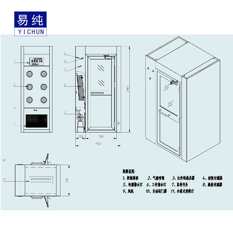 1.風淋室由箱體、風淋門、粗效過濾器、高效過濾器、風機、靜壓箱、噴嘴聯鎖控制器,操作面板,感應裝置等幾大部件組成。